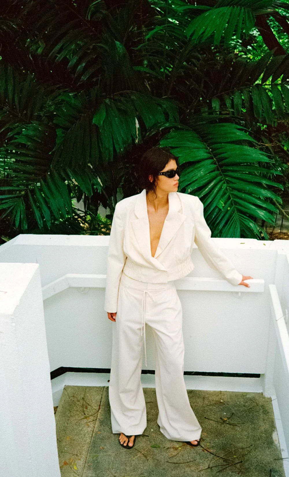 Astrid Wide Leg Pant in Ecru. These effortless pants feature a stylish faux drawstring and a relaxed fit, perfect for elevated holiday styling or a polished daytime look.