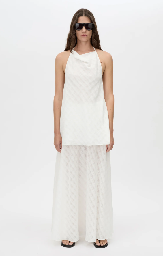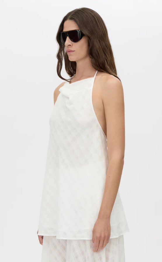 CAMILLA AND MARC Louise sheer check top with draped cowl neckline. Adjustable halter tie back. Bias cut for a relaxed fit.