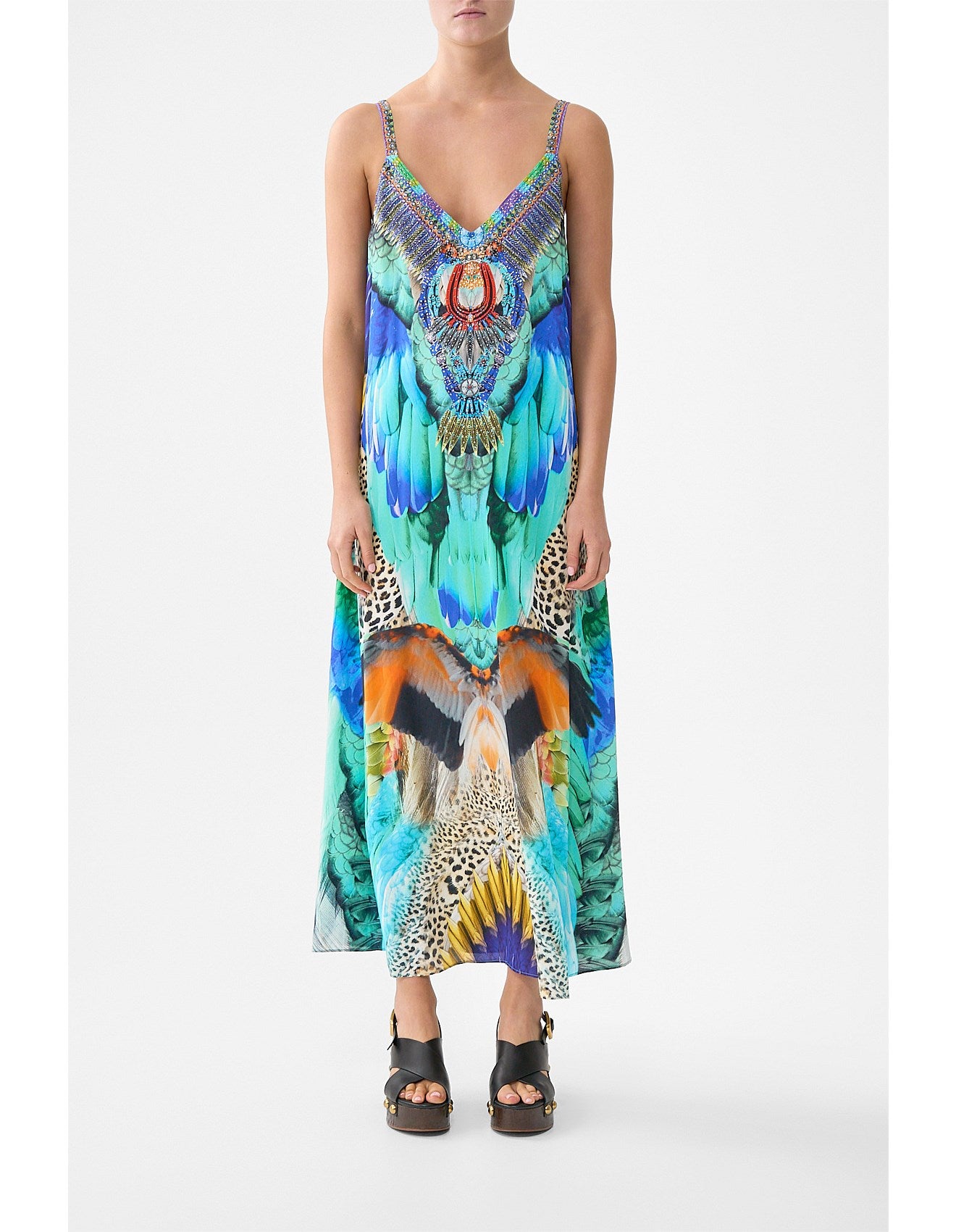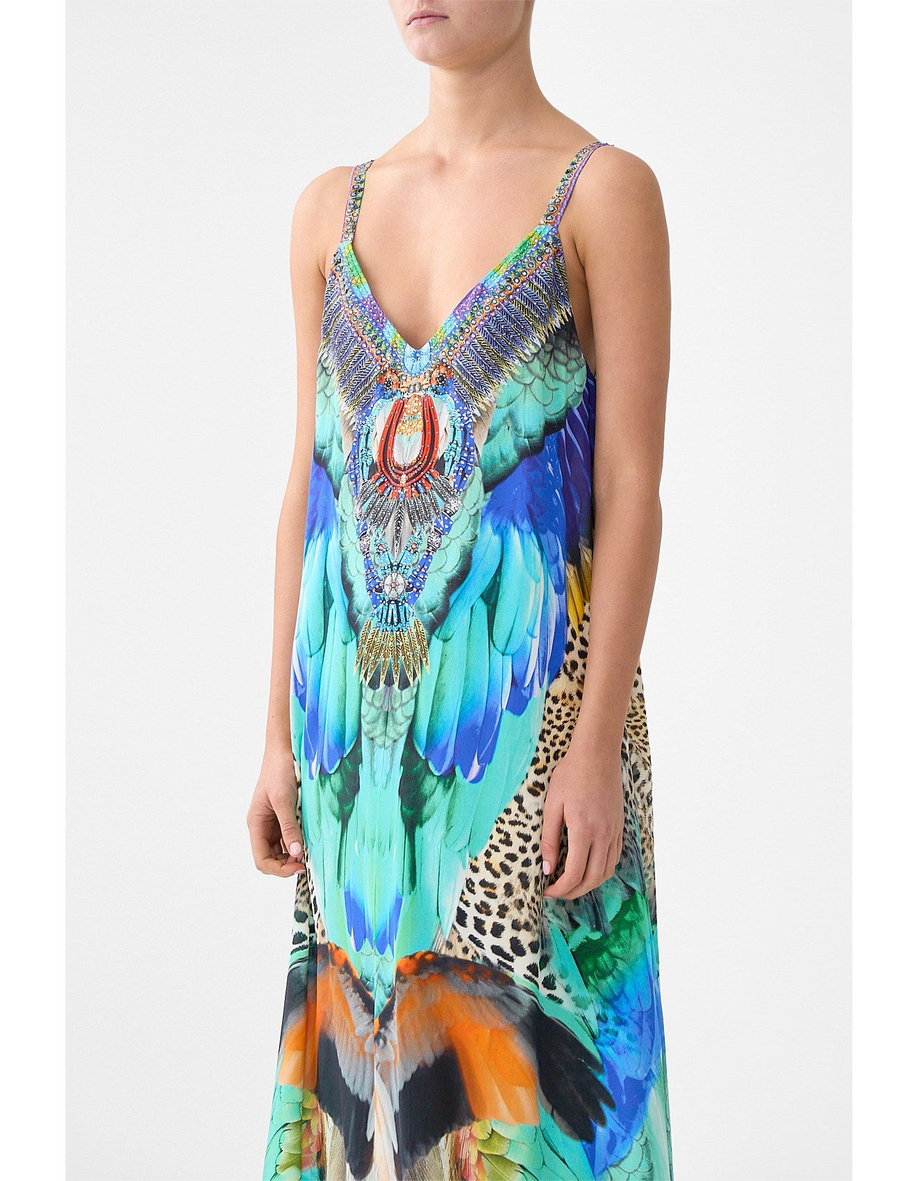 The Jungle Flight V Neck Midi Slip Dress is a handcrafted silk silhouette designed by our in house artisans. Reimagined in an exclusive limited edition print, this sumptuous slip dress features a V neckline decorated with intricately placed crystal embellishments for luminous, eye catching detail. It is cut with side splits and a flared hemline that falls effortlessly, adding romantic movement with every step.