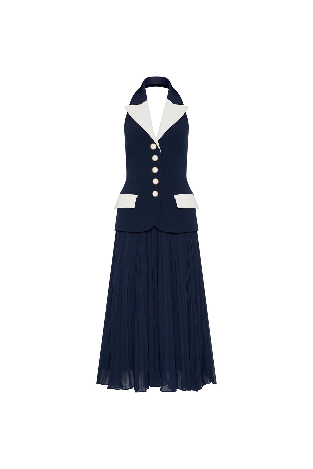 The Ula Midi Dress in navy blends timeless style with contemporary design, tailored from bonded crepe. Its contrasting halter neckline and sleek lapel sculpt a sophisticated silhouette, secured with buttons at the back of the neck for ease of wear. Princess seams create a polished finish, while the pleated midi skirt underlay enhances the elegant shape. Lined and completed with a back zip fastening, this dress is a refined addition to any wardrobe.