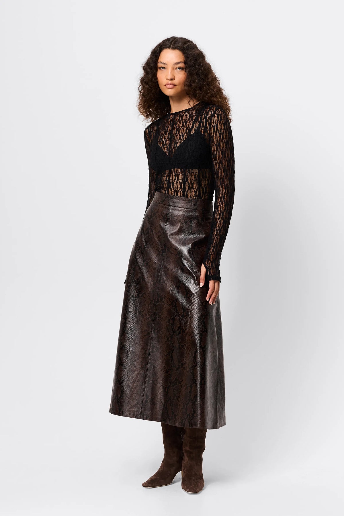The Close To You Top in Black delivers modern elegance with a subtle edge. Crafted in a sheer, spiderweb-like lace, it features a crew neckline and slim-fitting long sleeves with Mossman’s signature thumbhole to create a clean, elongated line through the body. Designed to skim the silhouette, it features vertical seaming detail throughout the body, balancing softness and strength, and making it a versatile layering piece or a statement worn on its own. Effortless, elevated and endlessly adaptable from day to night.