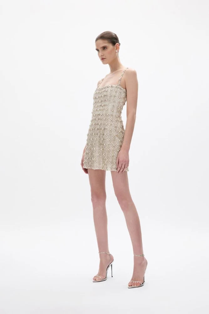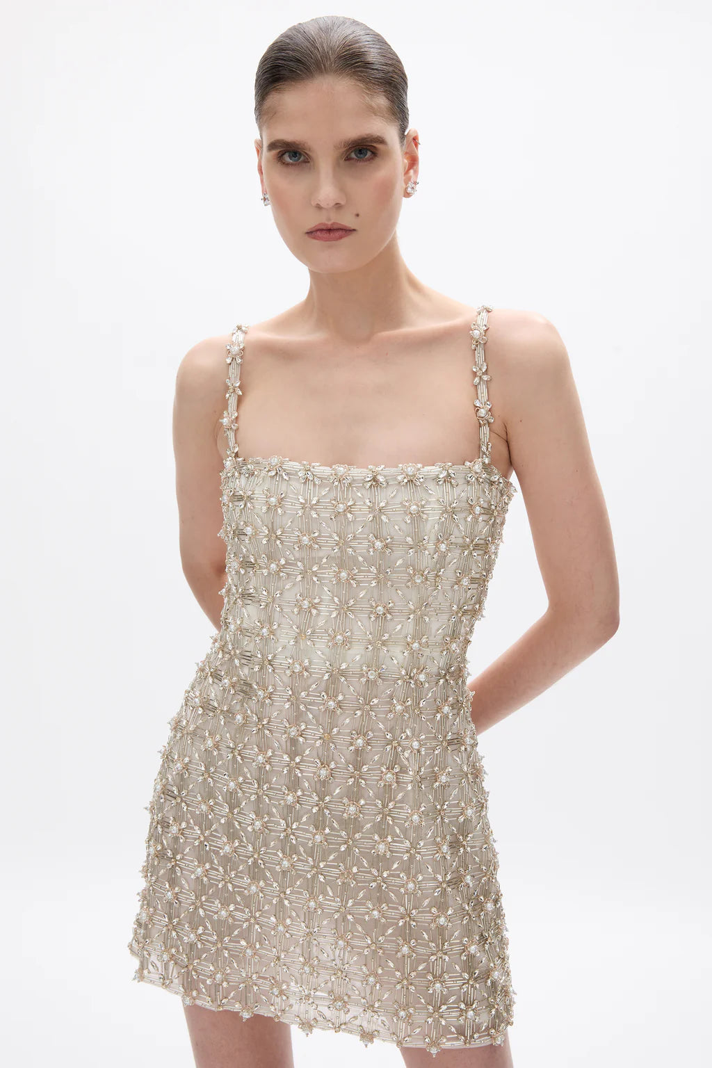 Designed for celebratory moments, the Austin Mini in Silver is a hand-embellished micro mini featuring glass tube beads and pearl accents. A structured internal corset shapes the silhouette, while the flared skirt adds playful movement for parties, events, or special occasions.