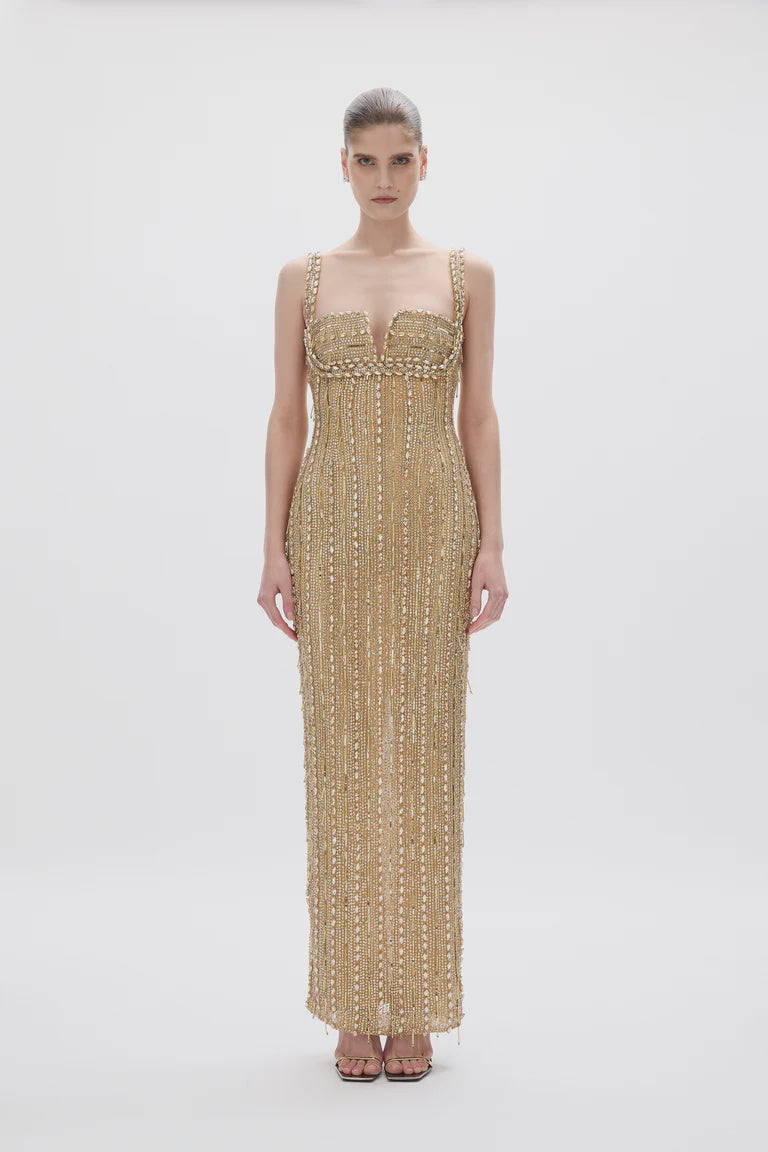 The Florentine Gown in Gold is a form-fitting silhouette adorned with hand-beaded embellishments in tonal gold, designed to catch the light from every angle. A sculpted fit and square neckline with a subtle V cut-out flatter the décolletage, making it ideal for evening events, weddings, and red-carpet occasions.