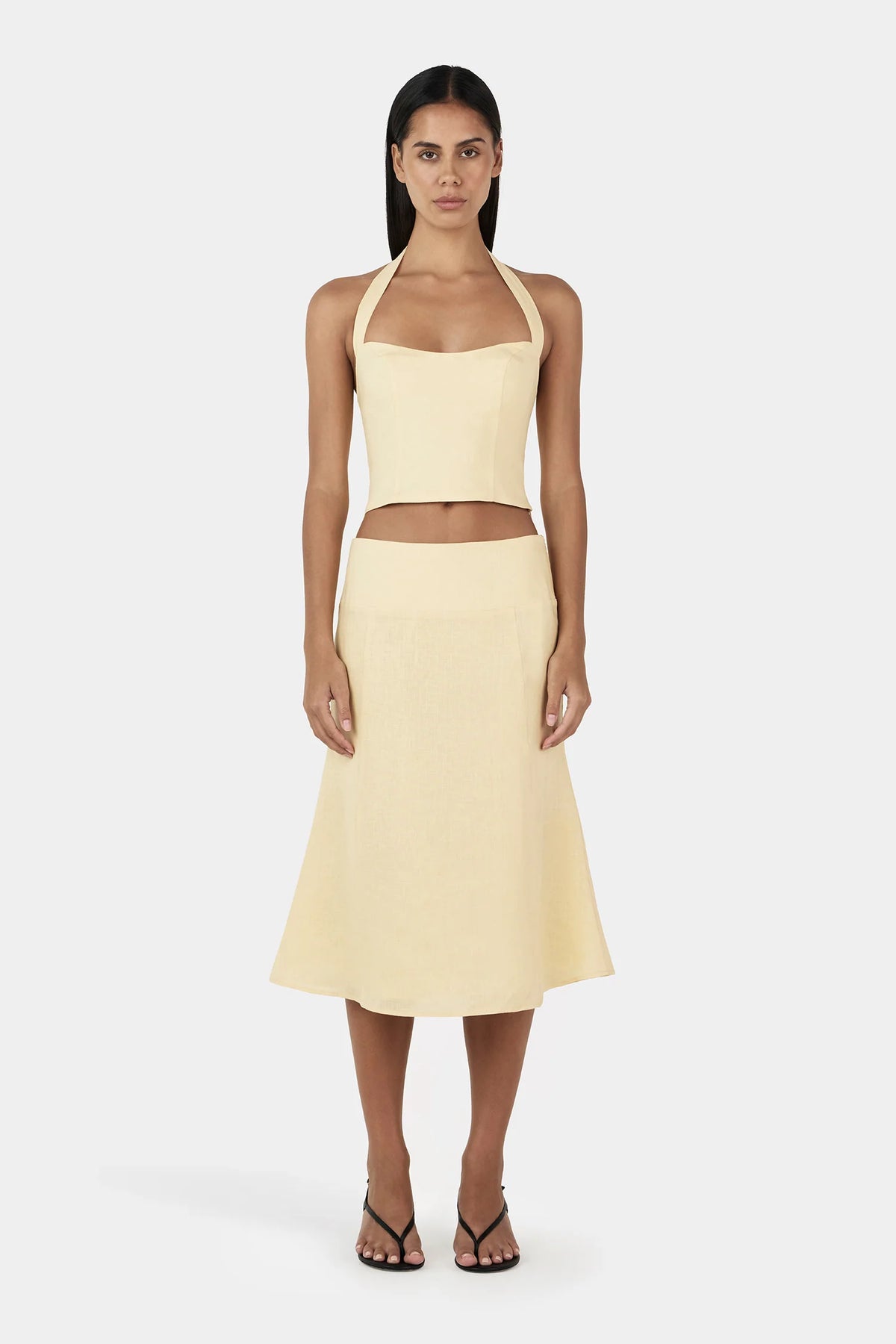 The Lee Lee Linen Top is a bodice corset top with princess seams for a flattering shape. There is a shirring panel at the back and wide straps that go into a halter neck. Pair with the matching Bambi Linen Skirt for a complete look.