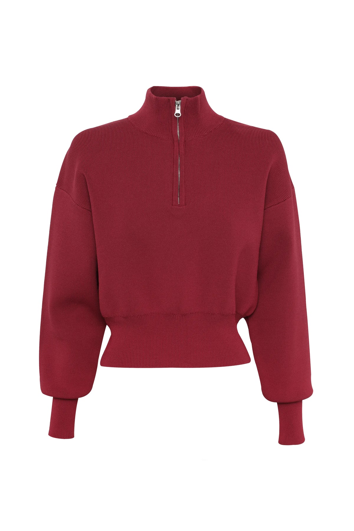 The Lexington Sweater in Rouge brings effortless polish to everyday knitwear. Crafted from Mossman’s signature milano crepe knit, this refined essential features a modern half-zip funnel neck with exposed silver hardware, and a softly bloused silhouette that balances structure with ease. The relaxed fit ends in a wide fitted ribbed hem and cuffs, delivering a flattering, contemporary shape that transitions seamlessly from elevated off-duty to understated workwear.