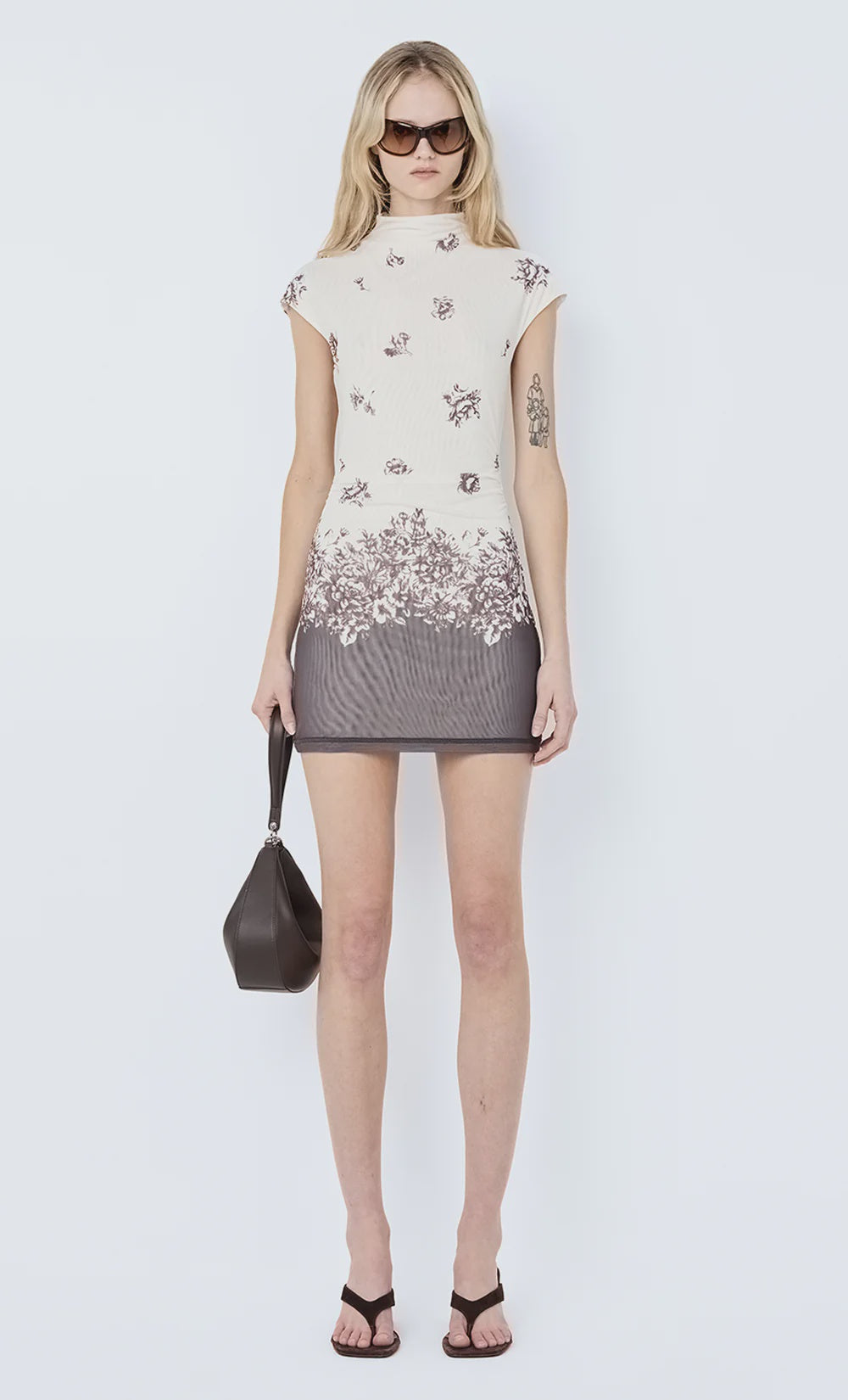 Violette Mini Dress in Carnation Floral. A floral mesh mini dress with a funnel neck, cap sleeves, and a carnation floral placement print, fully lined for a smooth fit. An elevated option for dinners, events, or evening occasions.