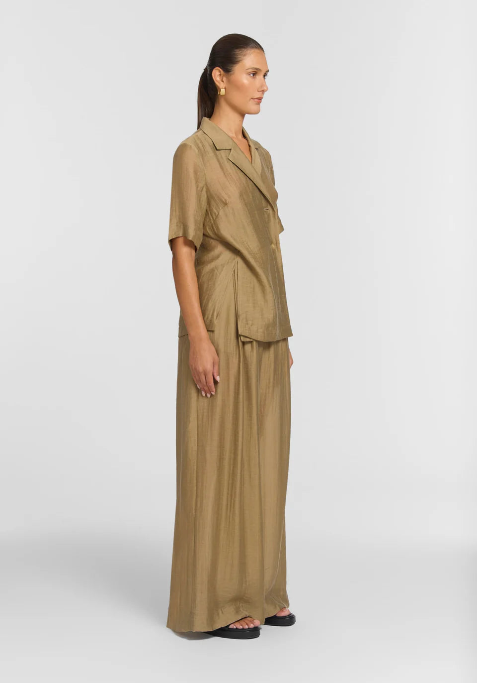 The Wolfhound Shirt, an elevated take on the classic shirt, exudes fluid, sophisticated ease in soft sage. Featuring a front wrap fastening, relaxed shoulders, a collar and lapel, and side-seam splits, it effortlessly carries you through summer events, the workday, and everything in between. Pair with the Irishman Pant for a summer set that speaks to the quiet power of form, or with the Vulture Leather Short for a chic mix of textures.