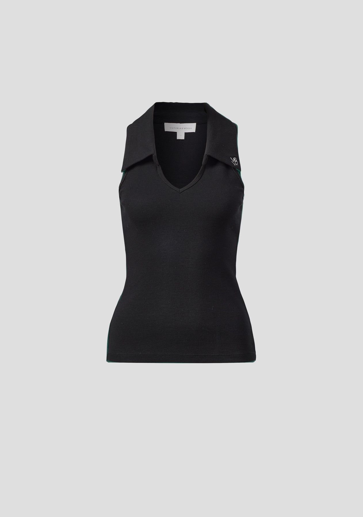 The United Top is a precise essential, crafted from our signature 2x2 organic cotton rib in black. Featuring a fitted silhouette with a curved V-neckline and collar, it’s finished with contrast V&W embroidery. Style with the Monologue Short for a pared-back monochrome moment, or with denim for everyday ease.