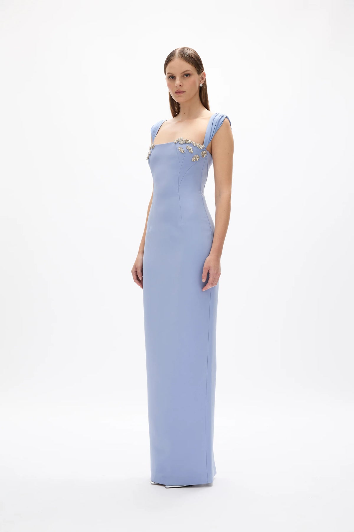 Exquisitely designed to celebrate the female form, crafted with a fitted with a corset and internal waist tape that works to enhance and define the silhouette. Jersey shoulder straps add a touch of comfort, seamlessly complementing the refined design. Adorned with hand-placed, intricately embellished details across the bust line, it exudes artisanal elegance.
